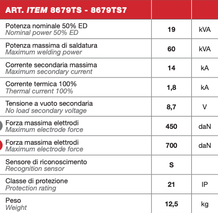 Briefly, the main features of this welding equipment can be summed up as follows: automatic identification of the connected tools; welding gun with integrated transformer enabling the connection to the welding system through an industrial socket and a set of quick fittings, thus allowing to avoid spanners, tools or screws for its replacement; welding gun main components i.e. transformer, arms, electrodes fully cooled by a closed loop cooling system, mounted on the cart of the system itself.