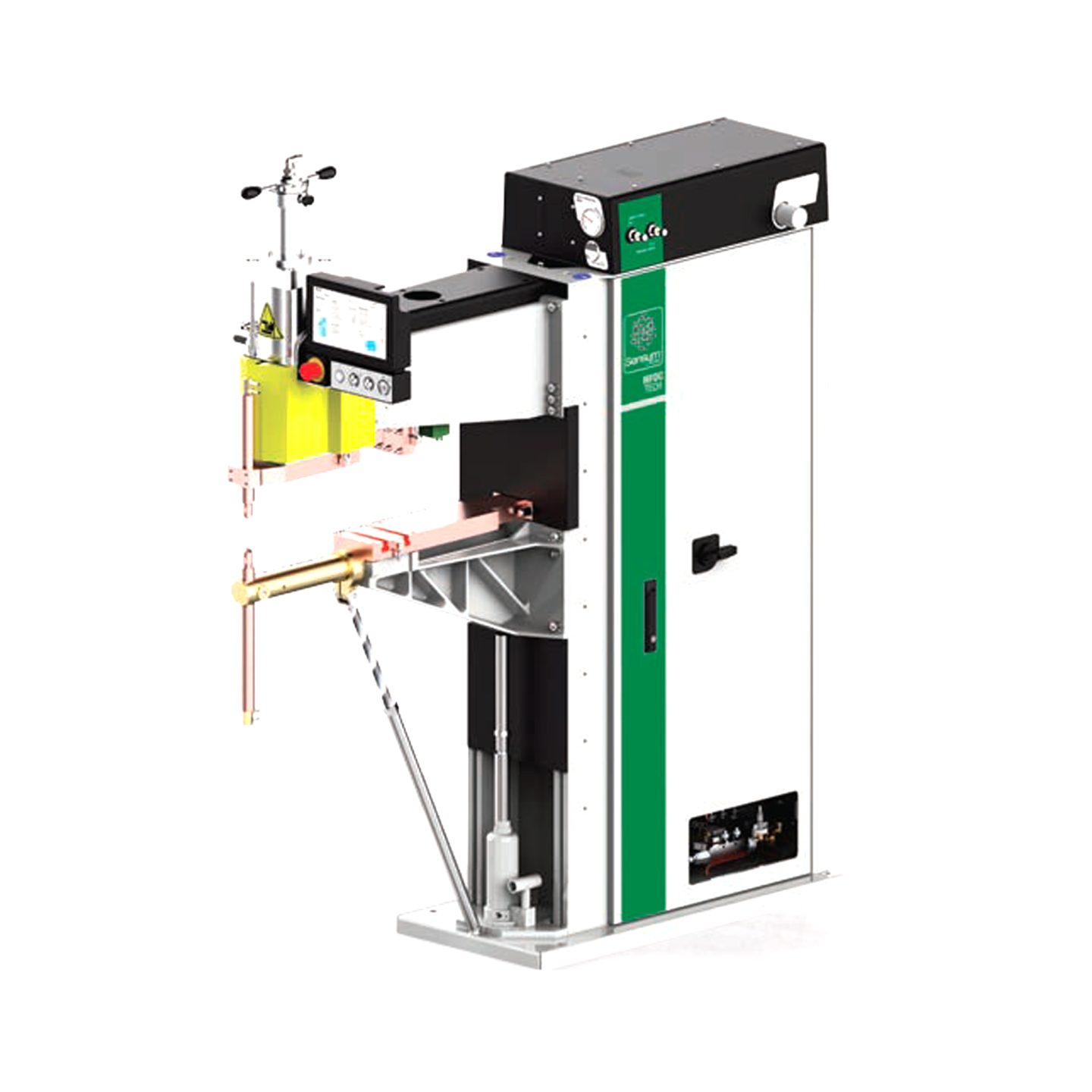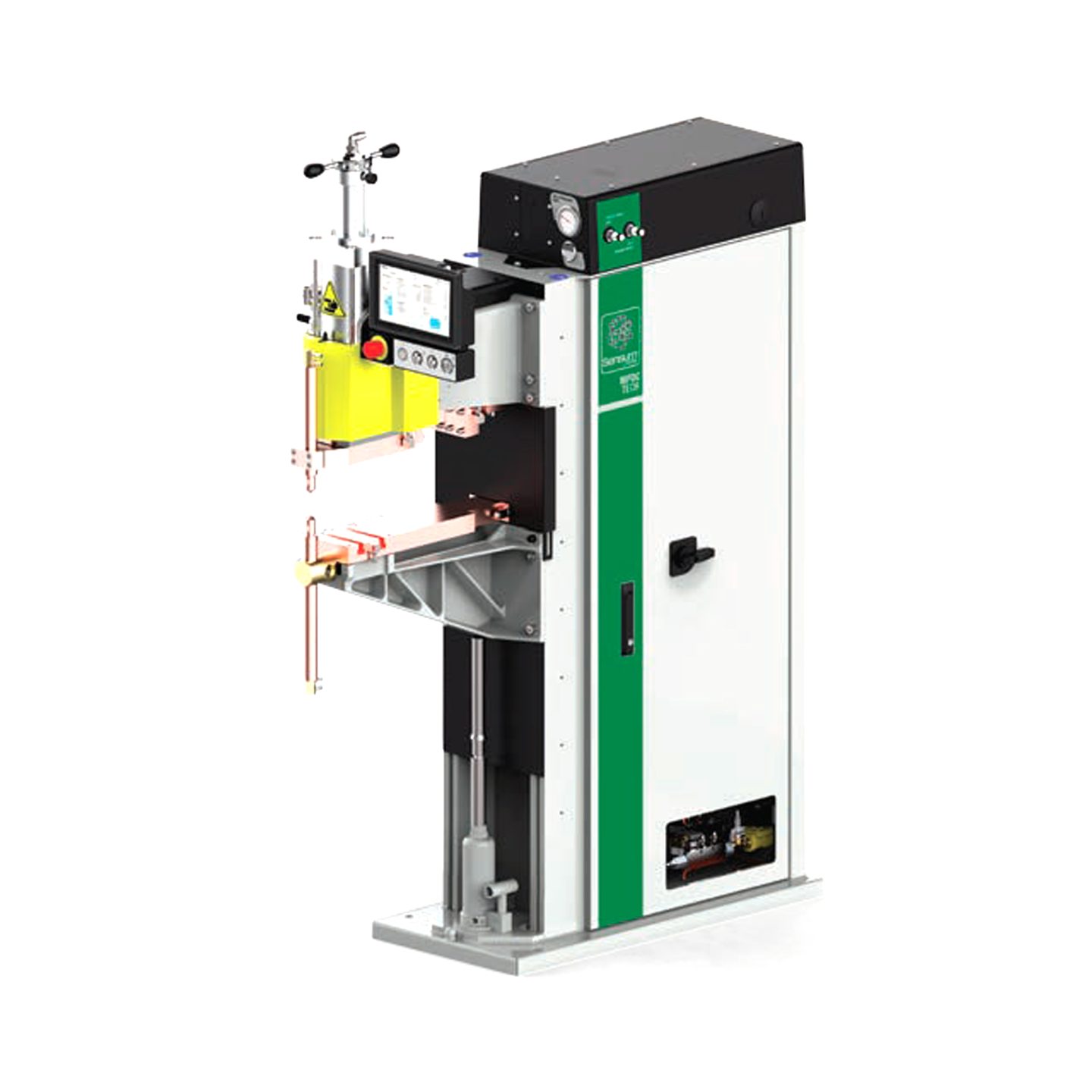 The compact dimensions of these welders, assembled with transformer, electronic control, SCR, cylinders, pneumatic system and cooling circuit, allow to carry out versatile multi-spot systems which can be modified with a minimum expense. By sharing the connection of the welders on 3 phases and by welding in sequence it is possible to carry out high productivity machines with minimum power supply from the electric mains.