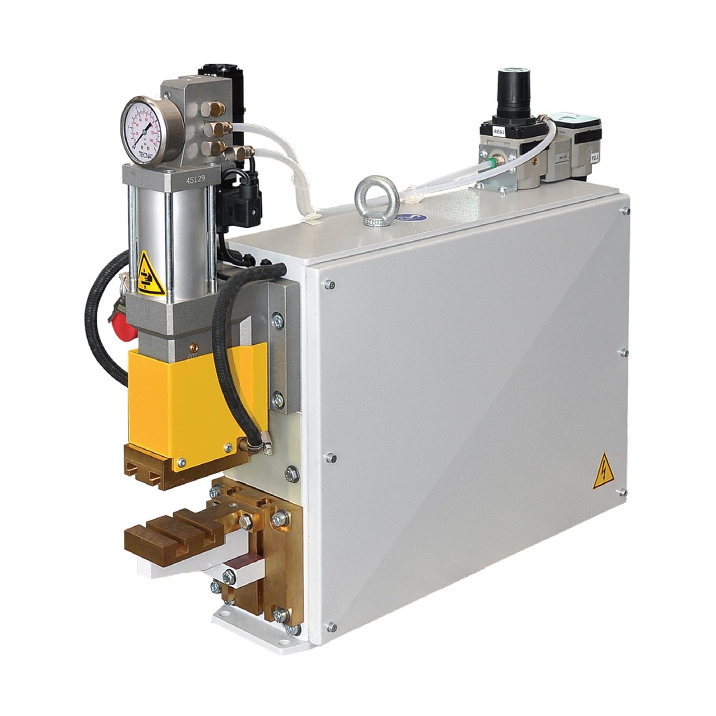 Spot and projection inverter bench welders with water-cooled transformer, plates, electrode-holders and electrodes; transformer with epoxy resin coated windings.